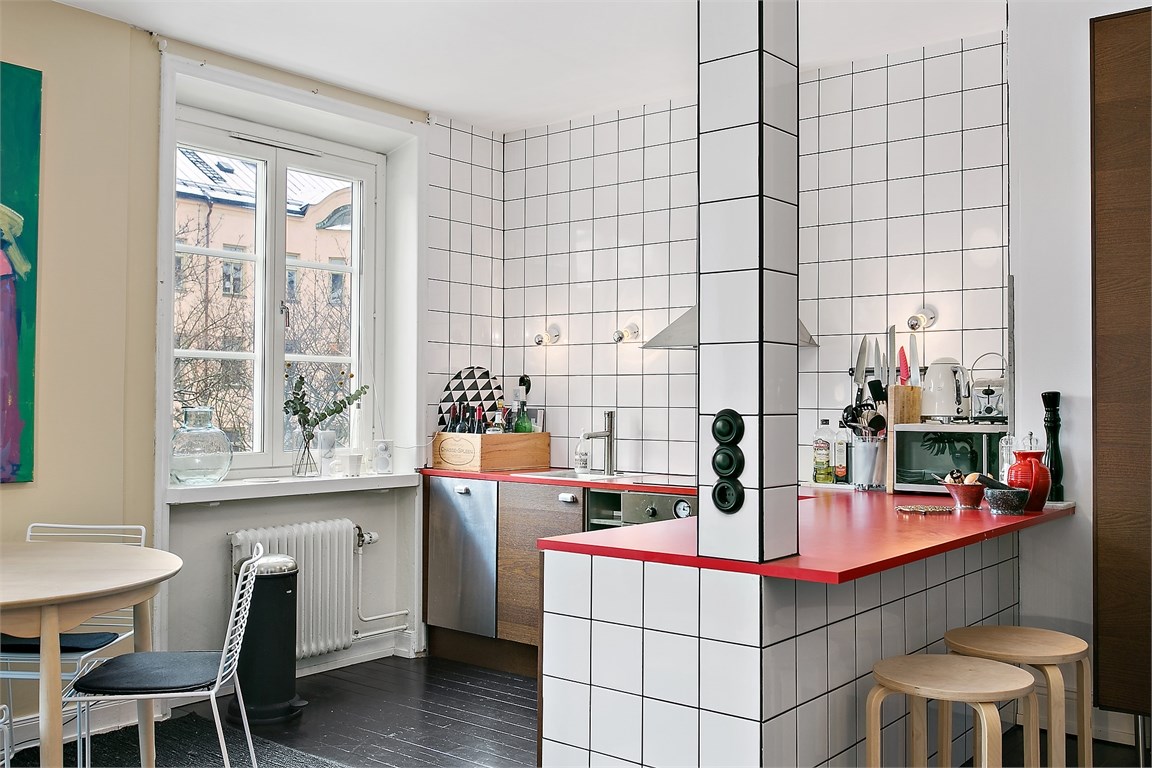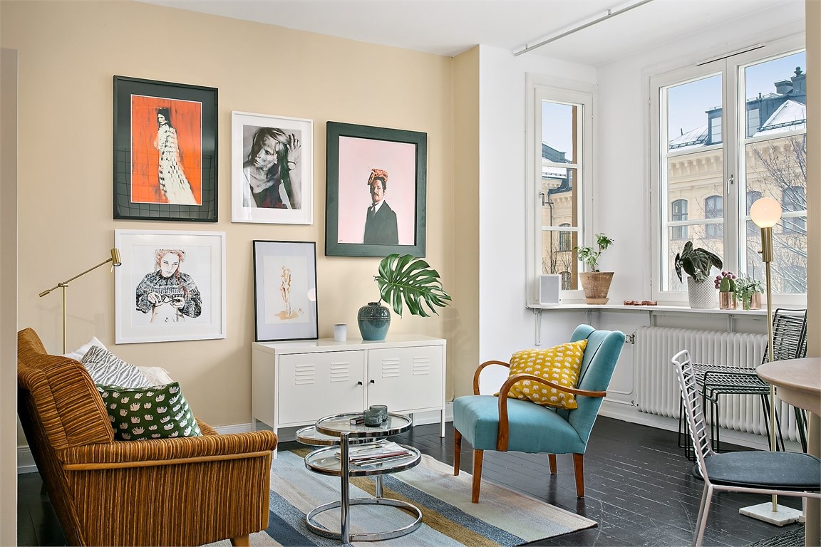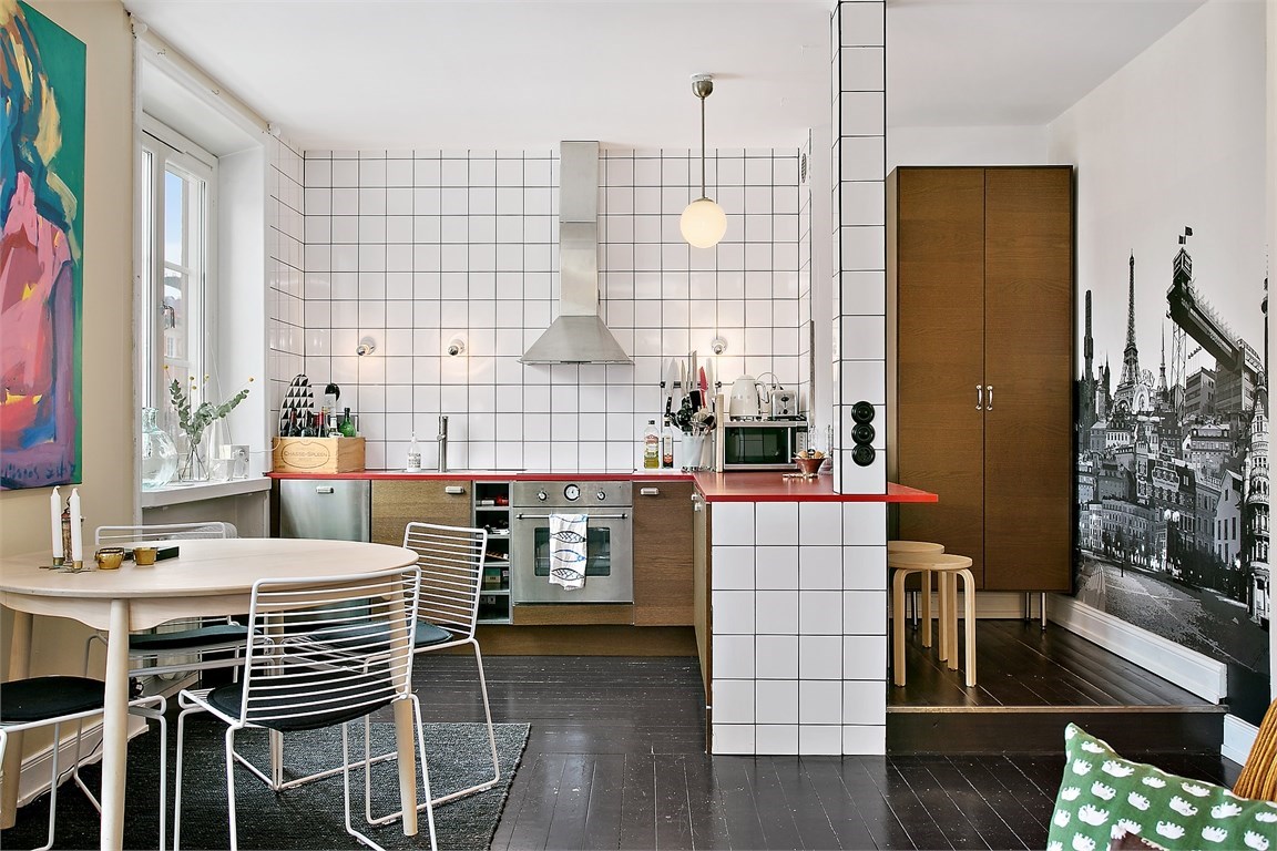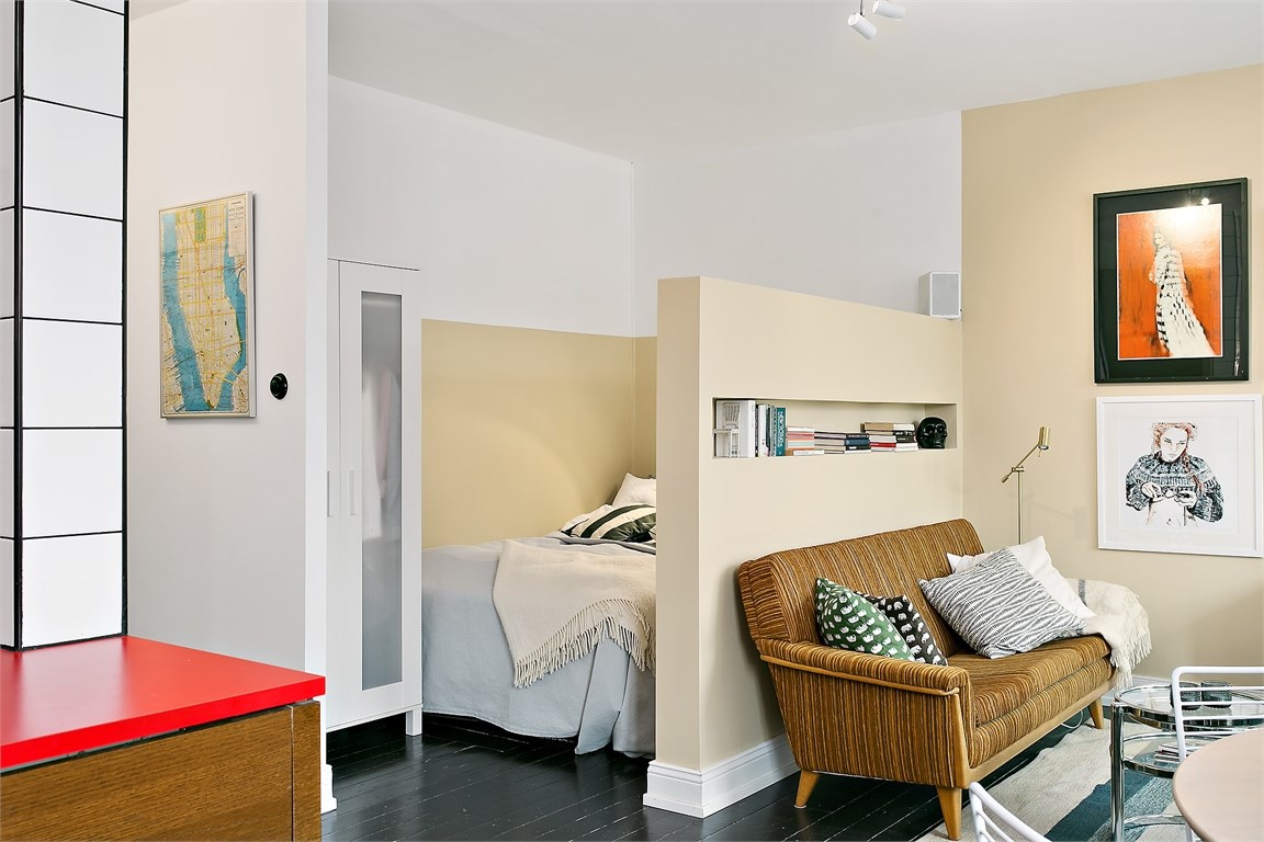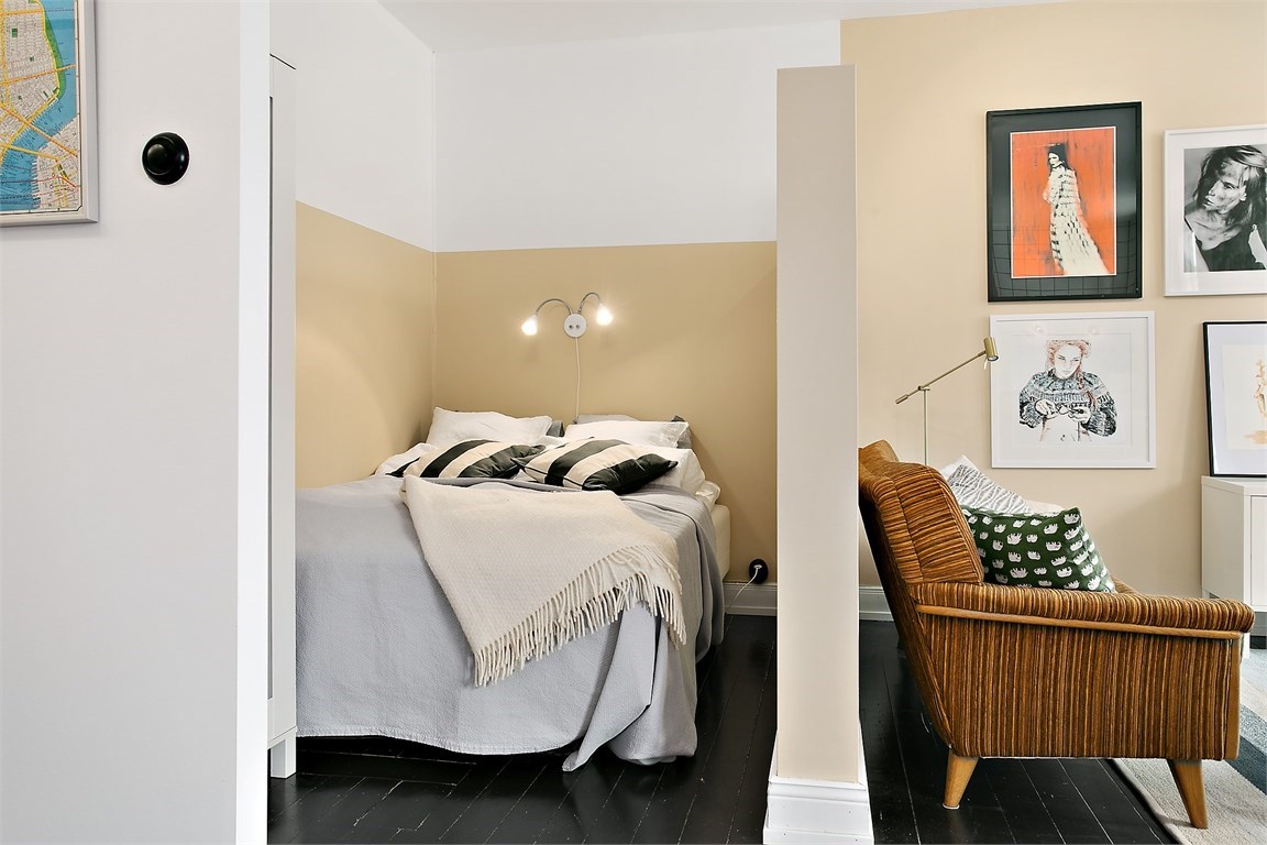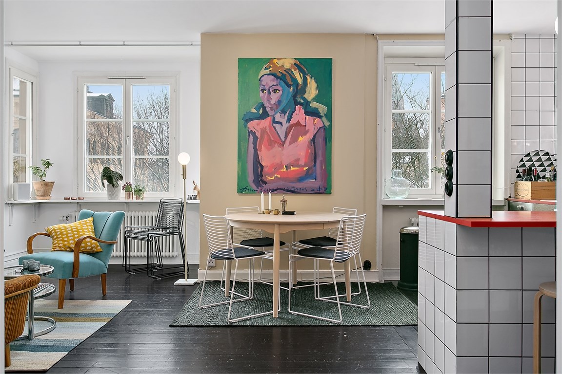 Fiecare detaliu din această garsonieră din Suedia a fost cu grijă ales pentru a crea o atmosferă de invidiat, în stil retro. Ne plac foarte mult tablourile alese, soluția de a despărți dormitorul de zona de zi și plăcile ceramice din bucătărie.